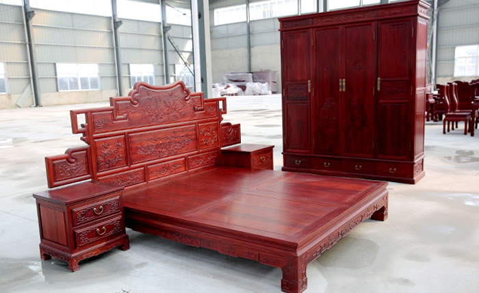 江蘇中尊木業(yè)有限公司臥室系列產(chǎn)品:佛光普照大佛龕,臥房四件套富貴大床、富貴大床床邊柜、四門(mén)衣柜等。